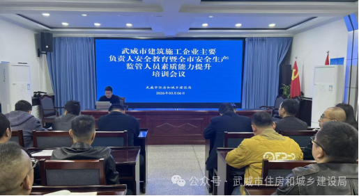 2026年3月6日,武威市住建局召开全市建筑施工企业主要负责人安全教育培训暨暨全市安全生产监管人员素质能力提升培训会议,会议传达学习了习近平总书记关于安全生产重要指示批示精神,贯彻落实了治本攻坚三年行动和省住建厅关于房屋市政工程生产安全重大事故隐患判定标准(2024版)教育培训要求,分析研究了2026年全市安全生产工作形势。各县区住建局、质保中心有关负责同志、建筑施工、监理企业主要负责同志等120余人参加培训。