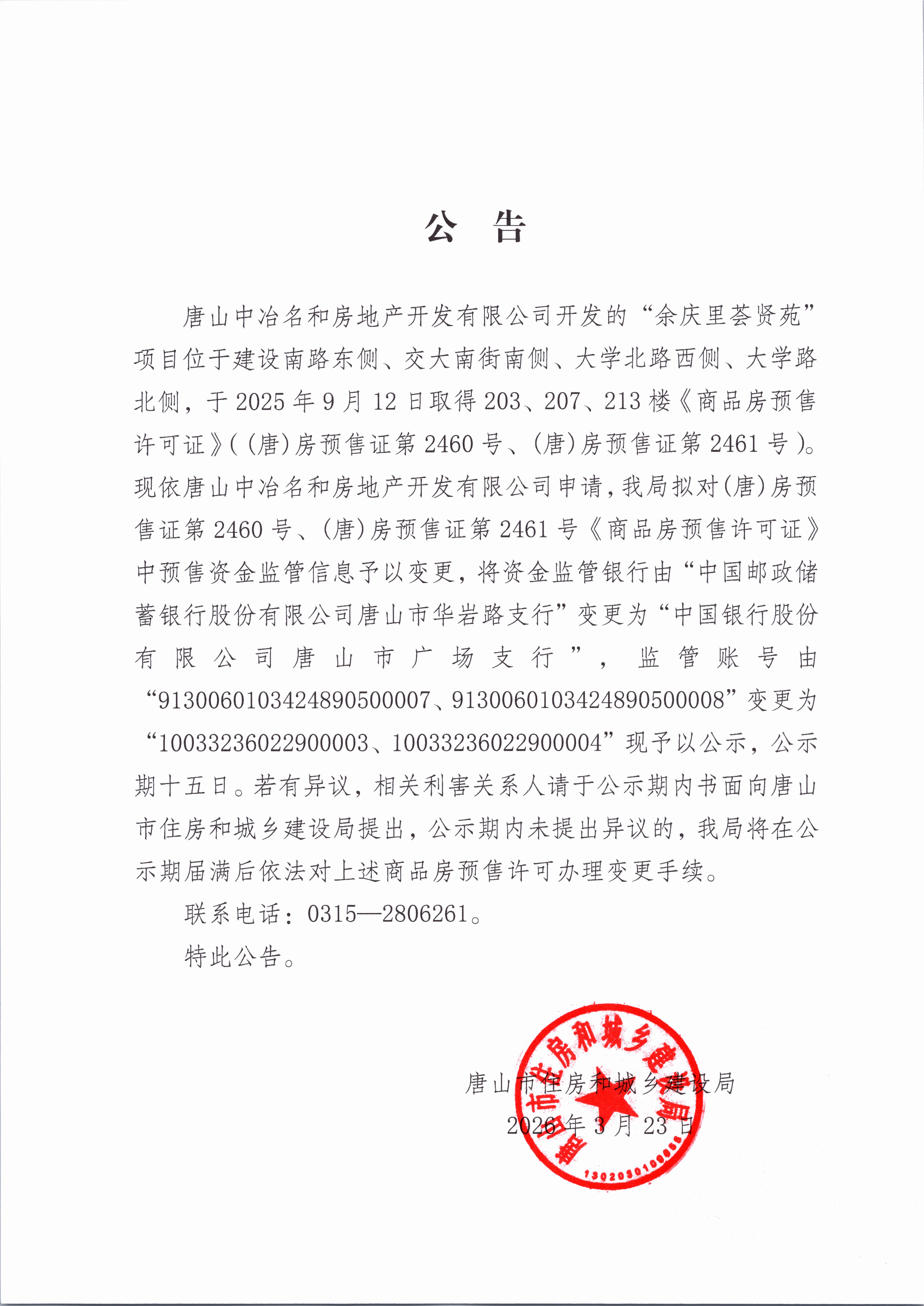唐山余庆里荟贤苑项目变更商品房预售许可资金监管信息的公告